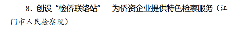 (二)整合统战部门和检察机关优势资源,进一步建立联动协作机制,创设全省首个“检侨联络站”,建立针对侨胞的专门检察法律服务平台,有效形成服务保障侨胞及其企业合法权益的多元化工作格局,为检察机关探索拓展为侨服务的途径发挥示范效应。